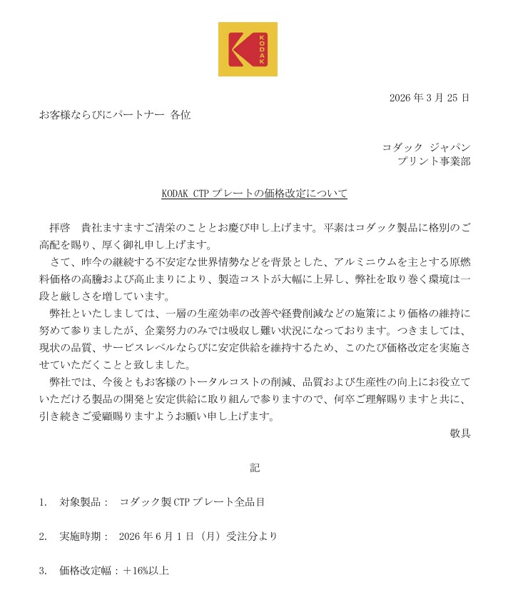 選挙ポスター専門店が利用している刷版CTP コダックジャパンより、中東情勢をふまえ材料となるアルミの価格の急騰による料金改定の発表されました。選挙ポスター専門店におきましても次第料金改定となります事をご案内します。